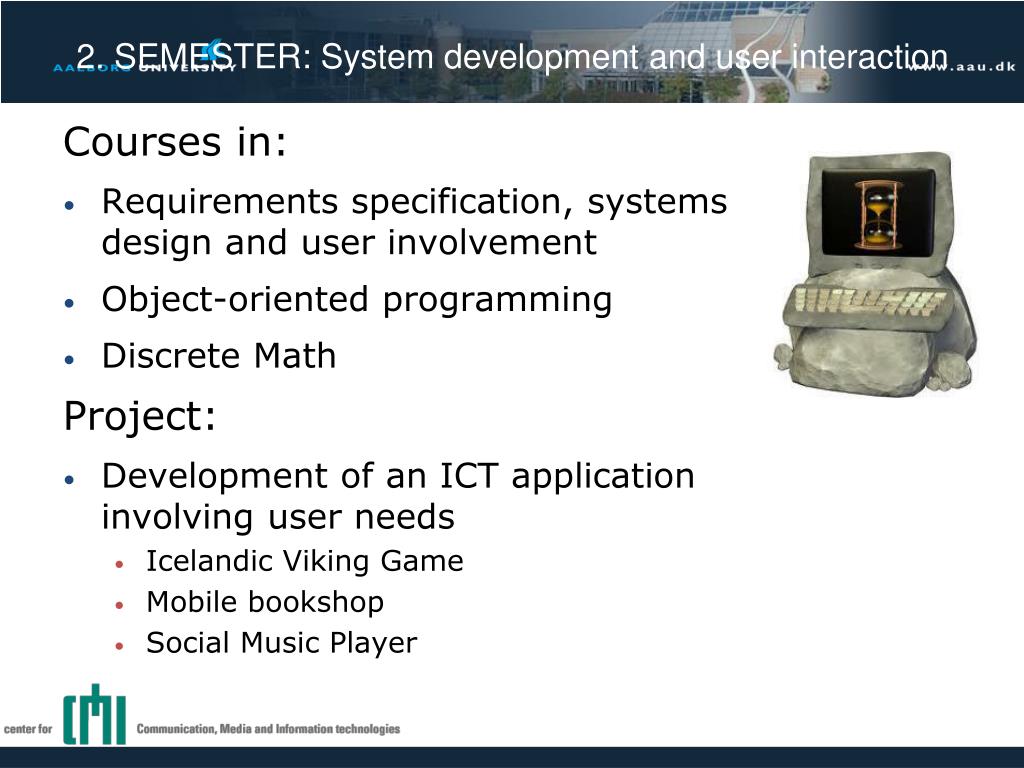2. SEMESTER: System development and user interaction • Courses in: • Requirementsspecification, systems design and userinvolvement • Object-orientedprogramming • DiscreteMath • Project: • Development of an ICT applicationinvolvinguserneeds • Icelandic Viking Game • Mobile bookshop • Social Music Player