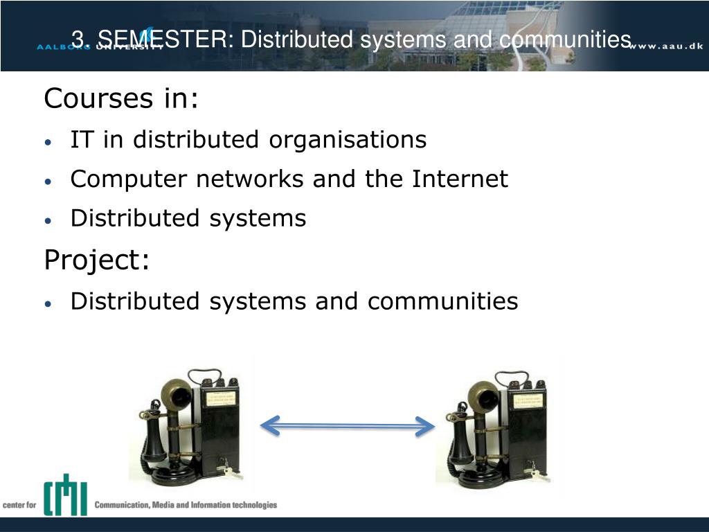 3. SEMESTER: Distributed systems and communities • Courses in: • IT in distributed organisations • Computer networks and the Internet • Distributed systems • Project: • Distributed systems and communities