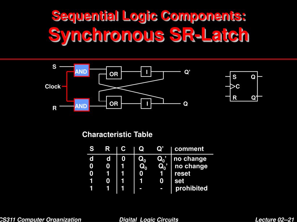 S Q R Q’ S R I Q’ OR OR I Q S R Q Comment Sequential Logic Components:SR-Latch Characteristic Table • Asynchronous operation • It responds to the input change • It is very dangerous operation when there are large number of flip flops or latches • => Synchronous operation 0 0 Q0 no change 0 1 0 reset 1 0 1 set 1 1 - prohibited CS311 Computer Organization