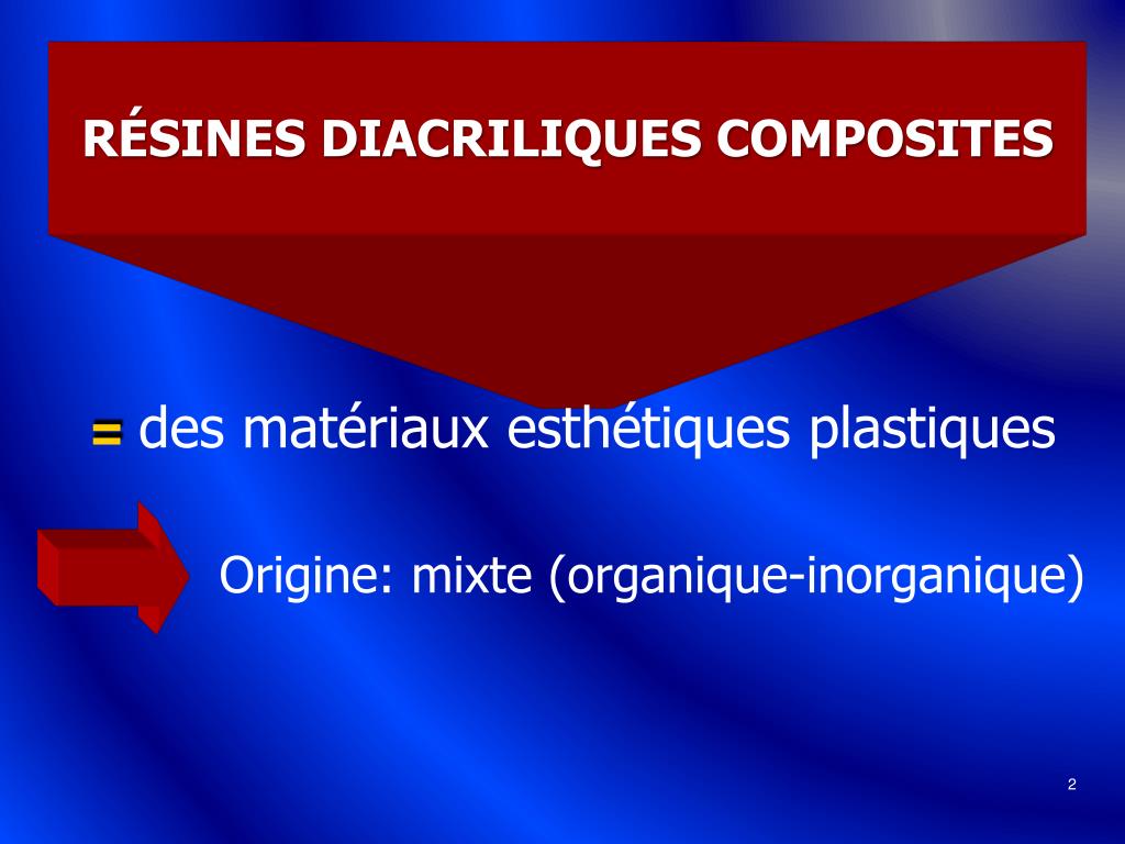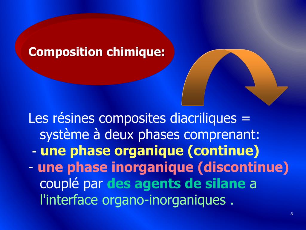 Composition chimique: Les résines composites diacriliques = système à deux phases comprenant: - une phase organique (continue) - une phase inorganique (discontinue)couplé par des agents de silane a l'interface organo-inorganiques .