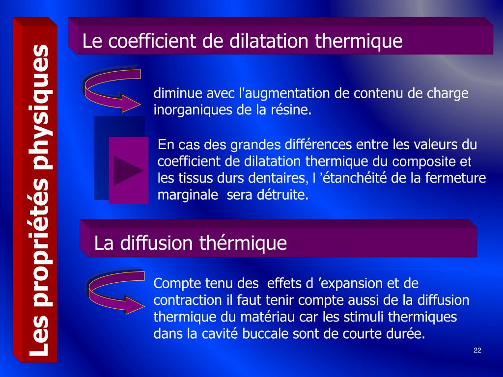Le coefficient de dilatation thermique diminue avec l'augmentation de contenu de charge inorganiques de la résine. En cas des grandes différences entre les valeurs du coefficient de dilatation thermique du compositeet les tissus durs dentaires, l ’étanchéité de la fermeture marginale sera détruite. Les propriétés physiques La diffusion thérmique Compte tenu des effets d ’expansion et de contraction il faut tenir compte aussi de la diffusion thermique du matériau car les stimuli thermiques dans la cavité buccale sont de courte durée.