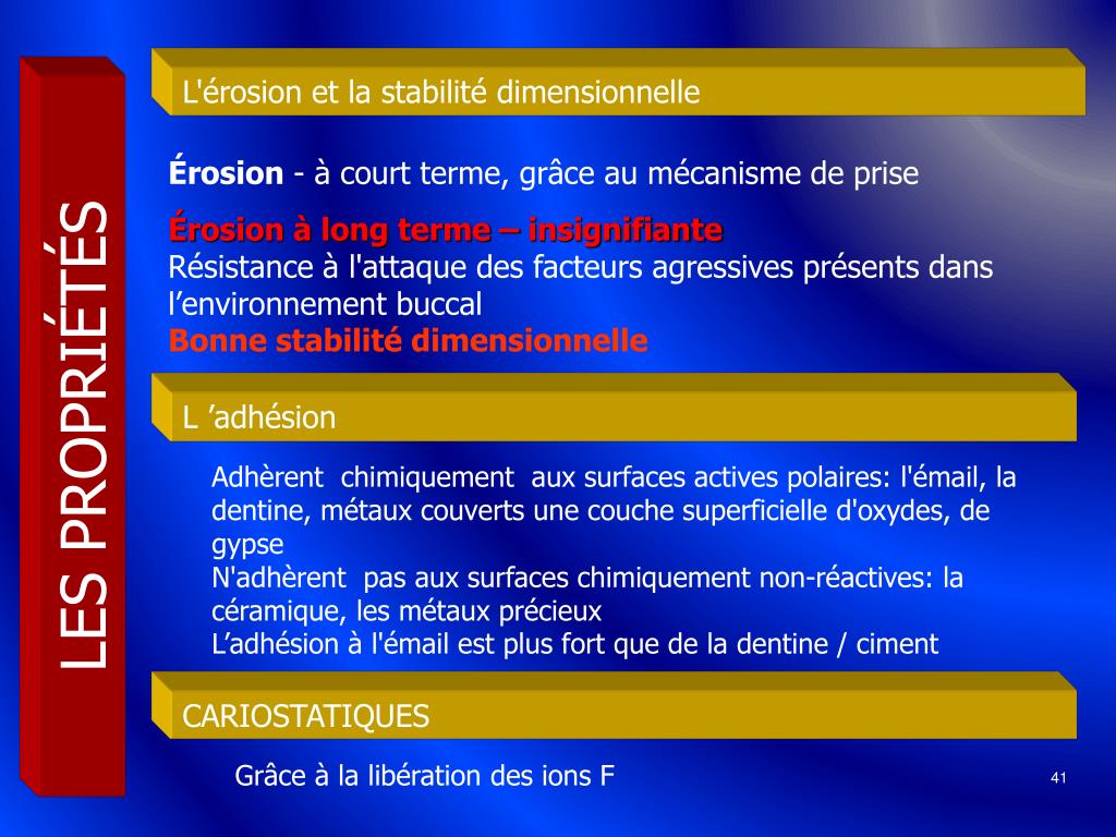 L'érosion et la stabilité dimensionnelle Érosion - à court terme, grâce au mécanisme de prise Érosion à long terme – insignifianteRésistance à l'attaque des facteurs agressives présents dans l’environnement buccalBonne stabilité dimensionnelle L ’adhésion LES PROPRIÉTÉS Adhèrent chimiquement aux surfaces actives polaires: l'émail, la dentine, métaux couverts une couche superficielle d'oxydes, de gypseN'adhèrent pas aux surfaces chimiquement non-réactives: la céramique, les métaux précieuxL’adhésion à l'émail est plus fort que de la dentine / ciment CARIOSTATIQUES Grâce à la libération des ions F