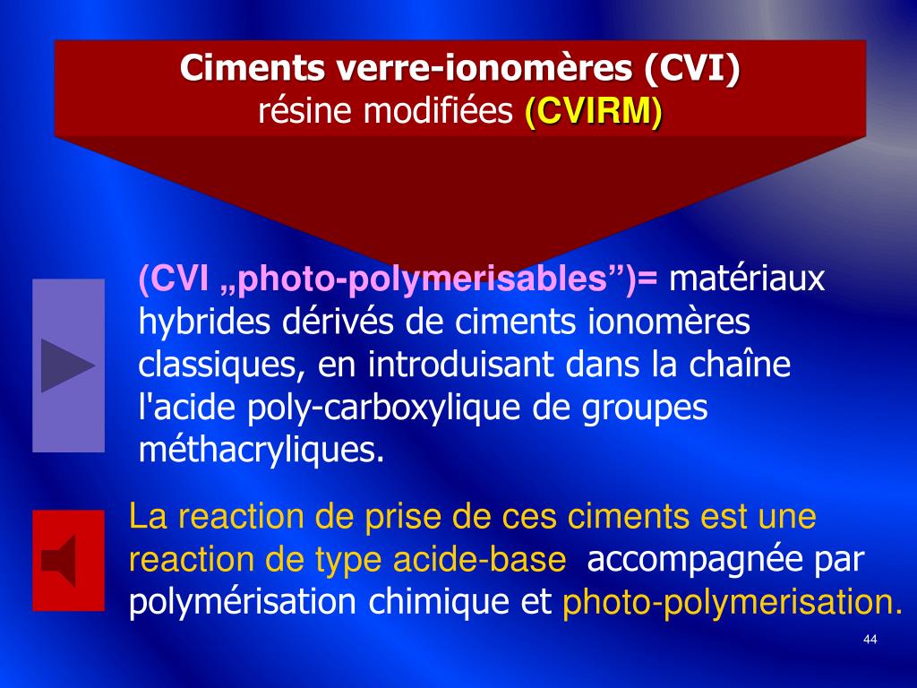 Ciments verre-ionomères (CVI) résine modifiées (CVIRM) (CVI „photo-polymerisables”)=matériaux hybrides dérivés de ciments ionomères classiques, en introduisant dans la chaîne l'acide poly-carboxylique de groupes méthacryliques. La reaction de prise de ces ciments est une reaction de type acide-base accompagnéepar polymérisation chimique et photo-polymerisation.