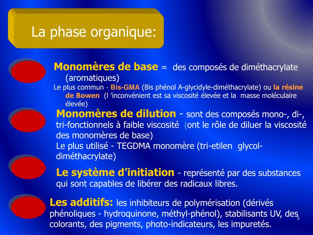 La phase organique: Monomères de base = des composés de diméthacrylate (aromatiques) Le plus commun -Bis-GMA(Bis phénol A-glycidyle-diméthacrylate) ou la résine de Bowen(l ’inconvénient est sa viscosité élevée et la masse moléculaire élevée) Monomères de dilution - sont des composés mono-, di-, tri-fonctionnels à faible viscosité (ont le rôle de diluer la viscosité des monomères de base) Le plus utilisé - TEGDMA monomère (tri-etilen glycol-diméthacrylate) Le système d’initiation - représenté par des substances qui sont capables de libérer des radicaux libres. Les additifs: les inhibiteurs de polymérisation (dérivés phénoliques - hydroquinone, méthyl-phénol), stabilisants UV, des colorants, des pigments, photo-indicateurs, les impuretés.