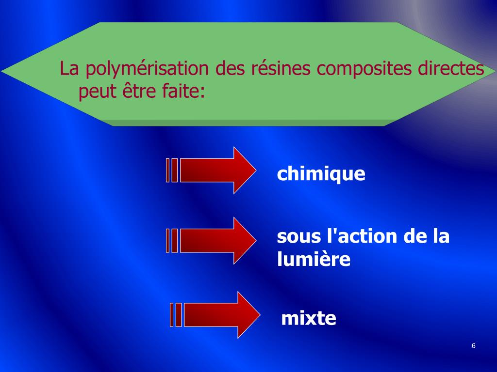La polymérisation des résines composites directes peut être faite: chimique sous l'action de la lumière mixte