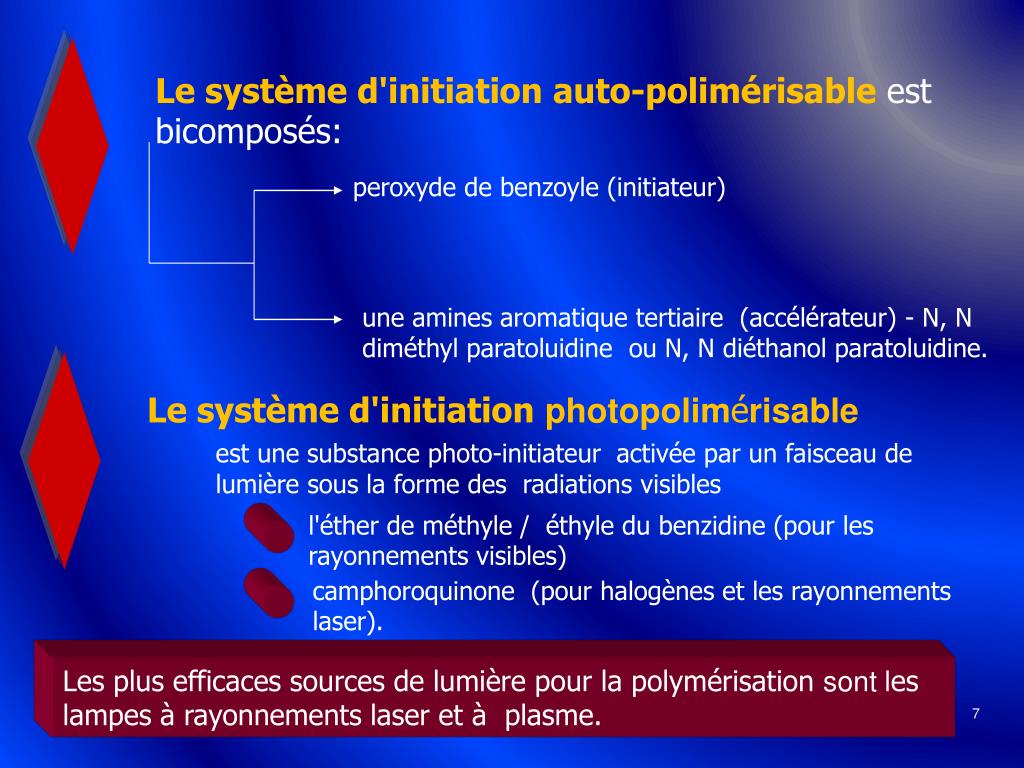 Le système d'initiation auto-polimérisable est bicomposés: peroxyde de benzoyle (initiateur) une amines aromatique tertiaire (accélérateur) - N, N diméthyl paratoluidine ou N, N diéthanol paratoluidine. Le système d'initiation photopolimérisable est une substance photo-initiateur activée par un faisceau de lumière sous la forme des radiations visibles l'éther de méthyle / éthyle du benzidine (pour les rayonnements visibles) camphoroquinone (pour halogènes et les rayonnements laser). Les plus efficaces sources de lumière pour la polymérisation sontles lampes à rayonnements laser et à plasme.