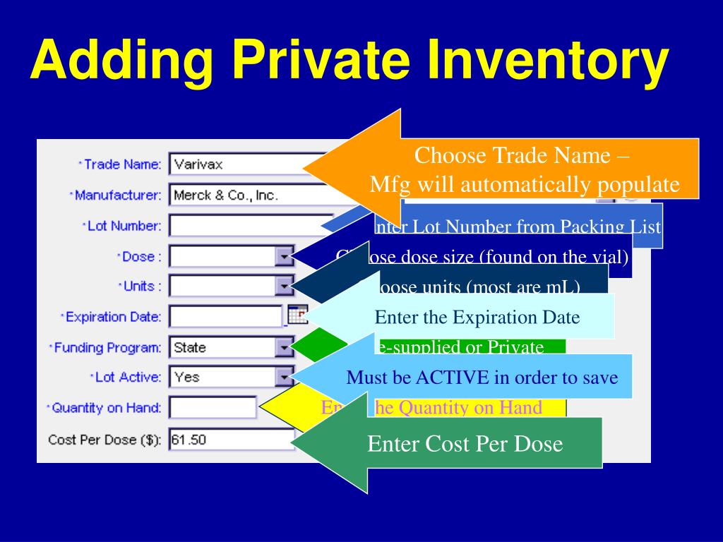 Adding Private Inventory Choose Trade Name – Mfg will automatically populate Enter Lot Number from Packing List Choose dose size (found on the vial) Choose units (most are mL) Enter the Expiration Date State-supplied or Private Must be ACTIVE in order to save Enter the Quantity on Hand Enter Cost Per Dose