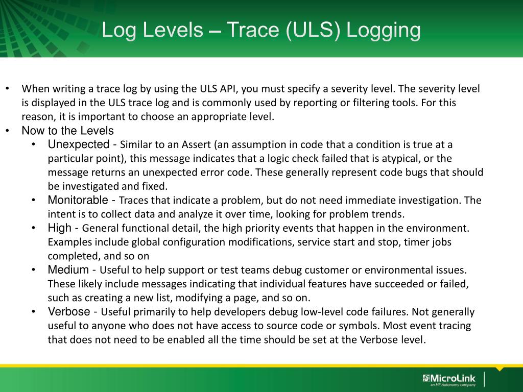Log Levels – Trace (ULS) Logging • When writing a trace log by using the ULS API, you must specify a severity level. The severity level is displayed in the ULS trace log and is commonly used by reporting or filtering tools. For this reason, it is important to choose an appropriate level. • Now to the Levels • Unexpected - Similar to an Assert (an assumption in code that a condition is true at a particular point), this message indicates that a logic check failed that is atypical, or the message returns an unexpected error code. These generally represent code bugs that should be investigated and fixed. • Monitorable - Traces that indicate a problem, but do not need immediate investigation. The intent is to collect data and analyze it over time, looking for problem trends. • High - General functional detail, the high priority events that happen in the environment. Examples include global configuration modifications, service start and stop, timer jobs completed, and so on • Medium - Useful to help support or test teams debug customer or environmental issues. These likely include messages indicating that individual features have succeeded or failed, such as creating a new list, modifying a page, and so on. • Verbose - Useful primarily to help developers debug low-level code failures. Not generally useful to anyone who does not have access to source code or symbols. Most event tracing that does not need to be enabled all the time should be set at the Verbose level.