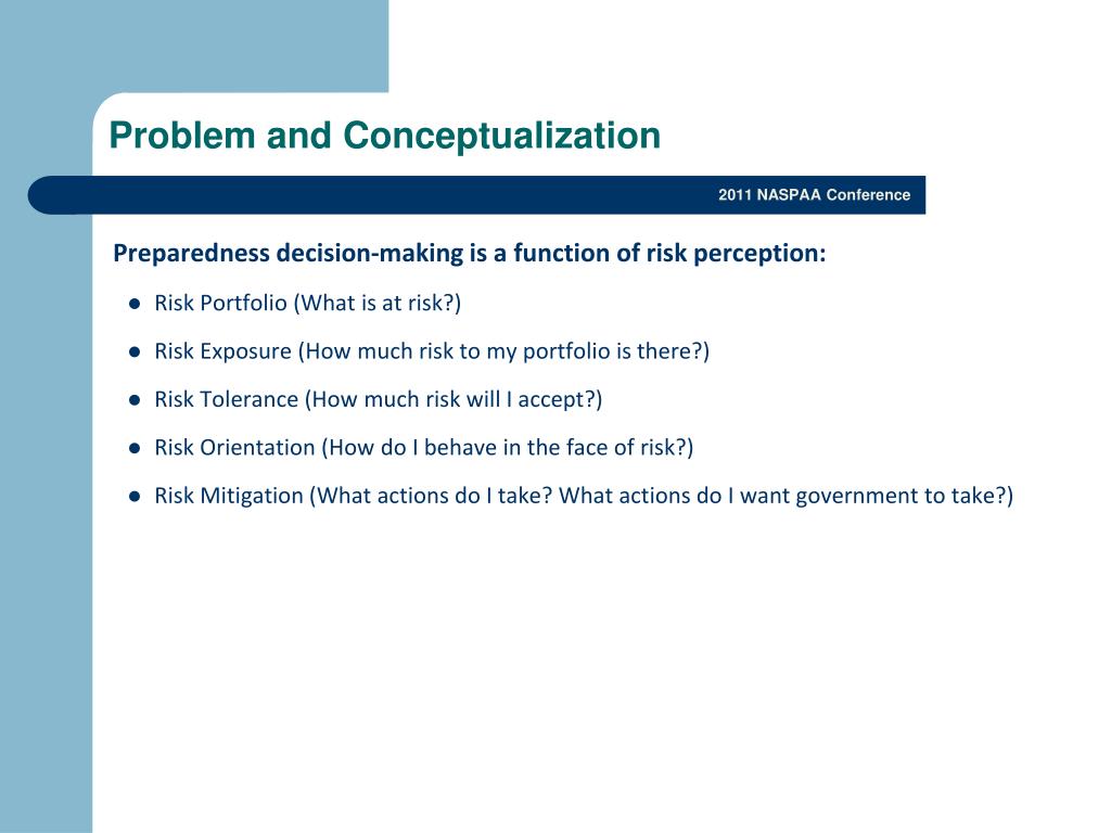Problem and Conceptualization • Preparedness decision-making is a function of risk perception: • Risk Portfolio (What is at risk?) • Risk Exposure (How much risk to my portfolio is there?) • Risk Tolerance (How much risk will I accept?) • Risk Orientation (How do I behave in the face of risk?) • Risk Mitigation (What actions do I take? What actions do I want government to take?)
