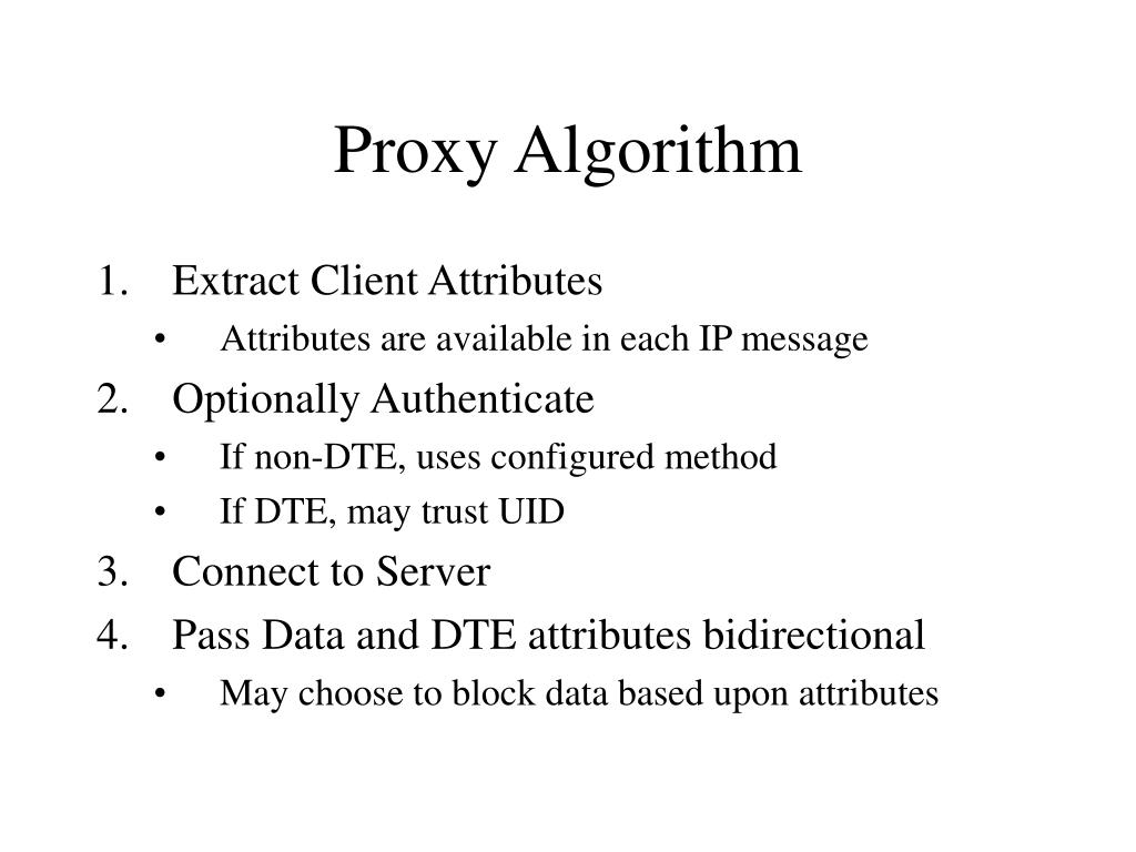 Proxy Algorithm • Extract Client Attributes • Attributes are available in each IP message • Optionally Authenticate • If non-DTE, uses configured method • If DTE, may trust UID • Connect to Server • Pass Data and DTE attributes bidirectional • May choose to block data based upon attributes