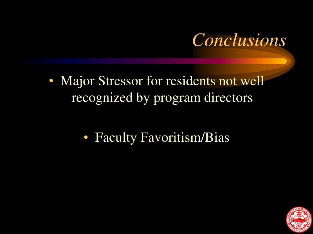 Conclusions • Major Stressor for residents not well recognized by program directors • Faculty Favoritism/Bias