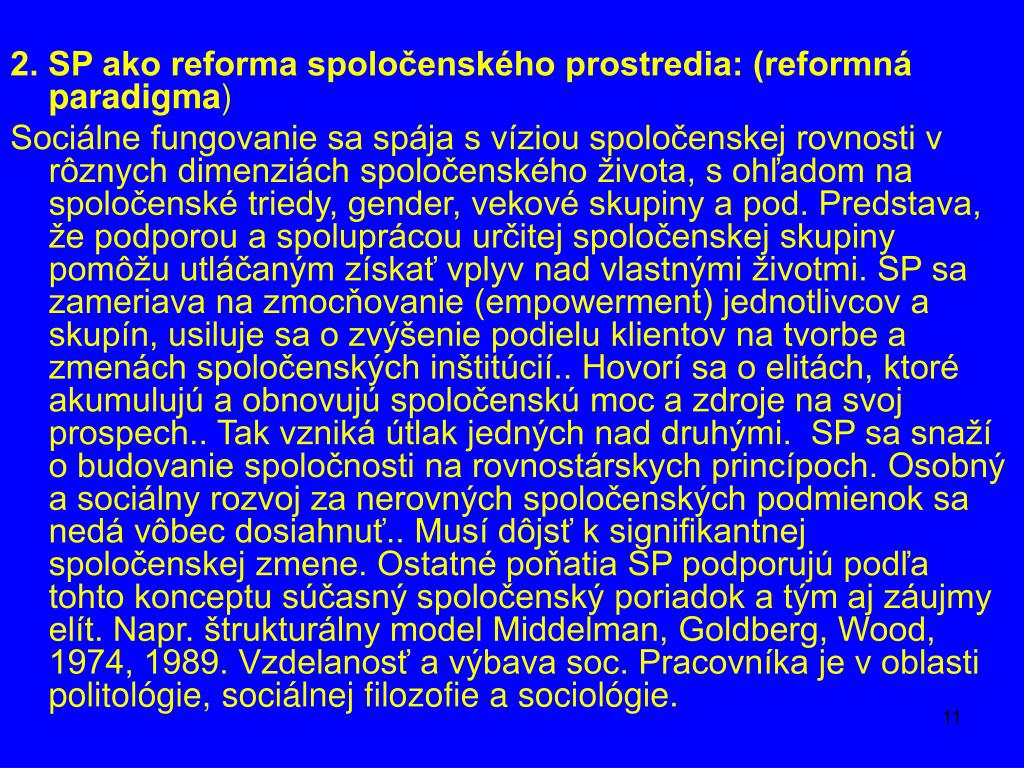 2. SP ako reforma spoločenského prostredia: (reformná paradigma) Sociálne fungovanie sa spája s víziou spoločenskej rovnosti v rôznych dimenziách spoločenského života, s ohľadom na spoločenské triedy, gender, vekové skupiny a pod. Predstava, že podporou a spoluprácou určitej spoločenskej skupiny pomôžu utláčaným získať vplyv nad vlastnými životmi. SP sa zameriava na zmocňovanie (empowerment) jednotlivcov a skupín, usiluje sa o zvýšenie podielu klientov na tvorbe a zmenách spoločenských inštitúcií.. Hovorí sa o elitách, ktoré akumulujú a obnovujú spoločenskú moc a zdroje na svoj prospech.. Tak vzniká útlak jedných nad druhými. SP sa snaží o budovanie spoločnosti na rovnostárskych princípoch. Osobný a sociálny rozvoj za nerovných spoločenských podmienok sa nedá vôbec dosiahnuť.. Musí dôjsť k signifikantnej spoločenskej zmene. Ostatné poňatia SP podporujú podľa tohto konceptu súčasný spoločenský poriadok a tým aj záujmy elít. Napr. štrukturálny model Middelman, Goldberg, Wood, 1974, 1989. Vzdelanosť a výbava soc. Pracovníka je v oblasti politológie, sociálnej filozofie a sociológie.