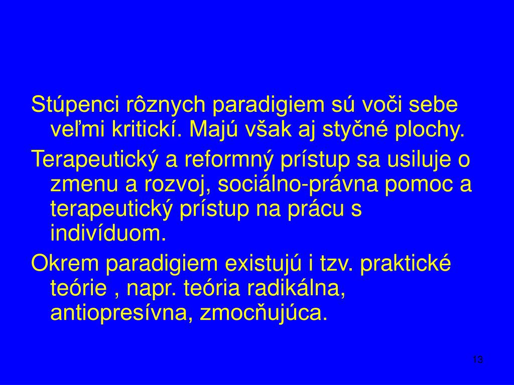 Stúpenci rôznych paradigiem sú voči sebe veľmi kritickí. Majú však aj styčné plochy. Terapeutický a reformný prístup sa usiluje o zmenu a rozvoj, sociálno-právna pomoc a terapeutický prístup na prácu s indivíduom. Okrem paradigiem existujú i tzv. praktické teórie , napr. teória radikálna, antiopresívna, zmocňujúca.