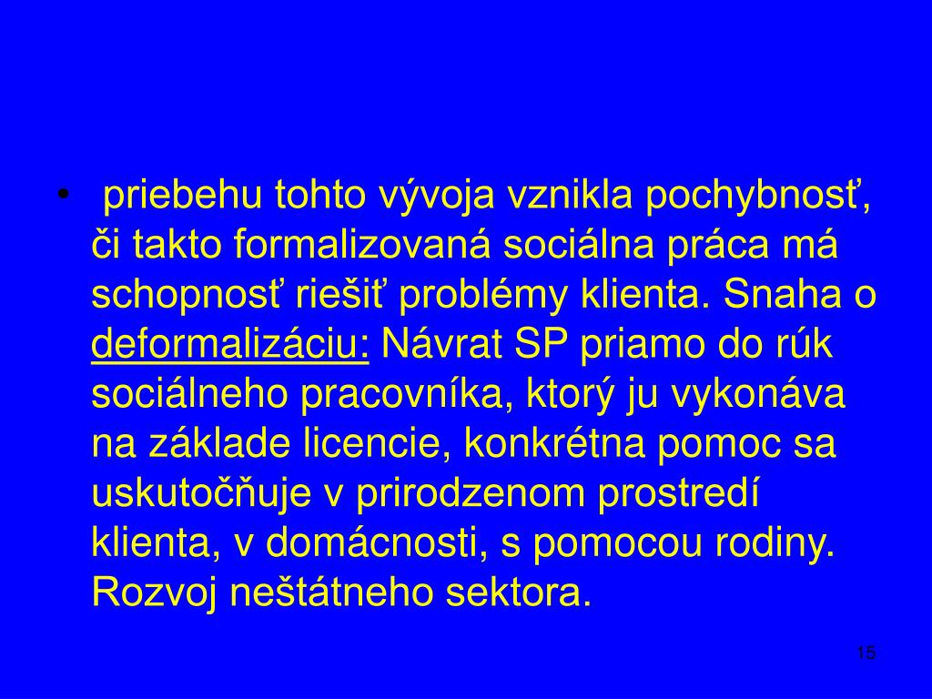 priebehu tohto vývoja vznikla pochybnosť, či takto formalizovaná sociálna práca má schopnosť riešiť problémy klienta. Snaha o deformalizáciu: Návrat SP priamo do rúk sociálneho pracovníka, ktorý ju vykonáva na základe licencie, konkrétna pomoc sa uskutočňuje v prirodzenom prostredí klienta, v domácnosti, s pomocou rodiny. Rozvoj neštátneho sektora.