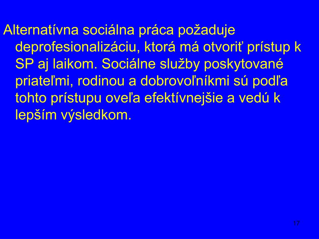 Alternatívna sociálna práca požaduje deprofesionalizáciu, ktorá má otvoriť prístup k SP aj laikom. Sociálne služby poskytované priateľmi, rodinou a dobrovoľníkmi sú podľa tohto prístupu oveľa efektívnejšie a vedú k lepším výsledkom.