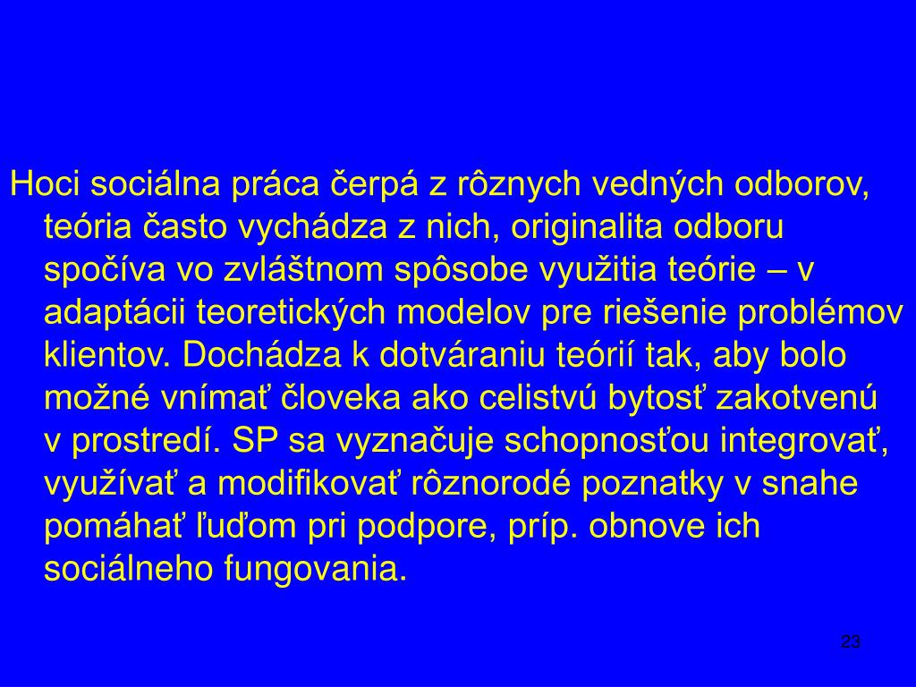 Hoci sociálna práca čerpá z rôznych vedných odborov, teória často vychádza z nich, originalita odboru spočíva vo zvláštnom spôsobe využitia teórie – v adaptácii teoretických modelov pre riešenie problémov klientov. Dochádza k dotváraniu teórií tak, aby bolo možné vnímať človeka ako celistvú bytosť zakotvenú v prostredí. SP sa vyznačuje schopnosťou integrovať, využívať a modifikovať rôznorodé poznatky v snahe pomáhať ľuďom pri podpore, príp. obnove ich sociálneho fungovania.