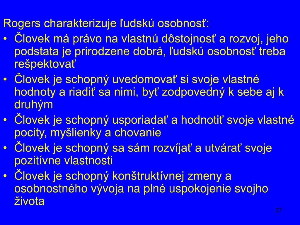 Rogers charakterizuje ľudskú osobnosť: • Človek má právo na vlastnú dôstojnosť a rozvoj, jeho podstata je prirodzene dobrá, ľudskú osobnosť treba rešpektovať • Človek je schopný uvedomovať si svoje vlastné hodnoty a riadiť sa nimi, byť zodpovedný k sebe aj k druhým • Človek je schopný usporiadať a hodnotiť svoje vlastné pocity, myšlienky a chovanie • Človek je schopný sa sám rozvíjať a utvárať svoje pozitívne vlastnosti • Človek je schopný konštruktívnej zmeny a osobnostného vývoja na plné uspokojenie svojho života