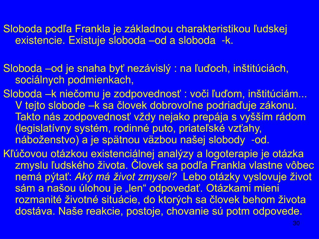 Sloboda podľa Frankla je základnou charakteristikou ľudskej existencie. Existuje sloboda –od a sloboda -k. Sloboda –od je snaha byť nezávislý : na ľuďoch, inštitúciách, sociálnych podmienkach, Sloboda –k niečomu je zodpovednosť : voči ľuďom, inštitúciám... V tejto slobode –k sa človek dobrovoľne podriaďuje zákonu. Takto nás zodpovednosť vždy nejako prepája s vyšším rádom (legislatívny systém, rodinné puto, priateľské vzťahy, náboženstvo) a je spätnou väzbou našej slobody -od. Kľúčovou otázkou existenciálnej analýzy a logoterapie je otázka zmyslu ľudského života. Človek sa podľa Frankla vlastne vôbec nemá pýtať: Aký má život zmysel? Lebo otázky vyslovuje život sám a našou úlohou je „len“ odpovedať. Otázkami mieni rozmanité životné situácie, do ktorých sa človek behom života dostáva. Naše reakcie, postoje, chovanie sú potm odpovede.