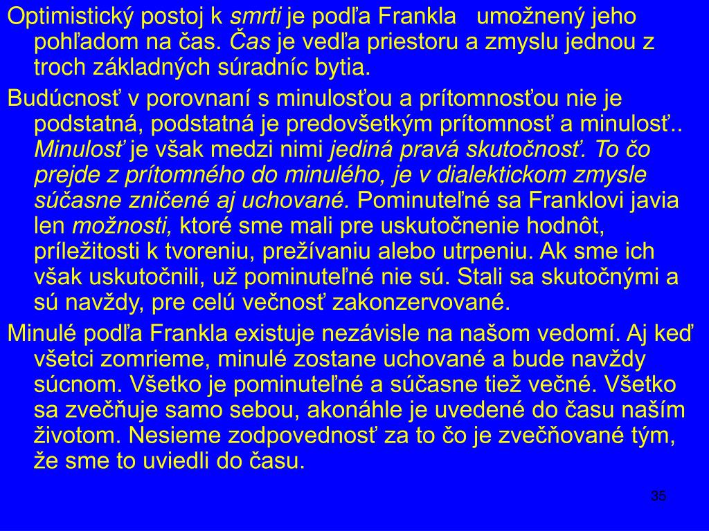 Optimistický postoj k smrti je podľa Frankla umožnený jeho pohľadom na čas. Čas je vedľa priestoru a zmyslu jednou z troch základných súradníc bytia. Budúcnosť v porovnaní s minulosťou a prítomnosťou nie je podstatná, podstatná je predovšetkým prítomnosť a minulosť.. Minulosť je však medzi nimi jediná pravá skutočnosť. To čo prejde z prítomného do minulého, je v dialektickom zmysle súčasne zničené aj uchované. Pominuteľné sa Franklovi javia len možnosti, ktoré sme mali pre uskutočnenie hodnôt, príležitosti k tvoreniu, prežívaniu alebo utrpeniu. Ak sme ich však uskutočnili, už pominuteľné nie sú. Stali sa skutočnými a sú navždy, pre celú večnosť zakonzervované. Minulé podľa Frankla existuje nezávisle na našom vedomí. Aj keď všetci zomrieme, minulé zostane uchované a bude navždy súcnom. Všetko je pominuteľné a súčasne tiež večné. Všetko sa zvečňuje samo sebou, akonáhle je uvedené do času naším životom. Nesieme zodpovednosť za to čo je zvečňované tým, že sme to uviedli do času.