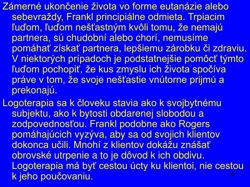 Zámerné ukončenie života vo forme eutanázie alebo sebevraždy, Frankl principiálne odmieta. Trpiacim ľuďom, ľuďom nešťastným kvôli tomu, že nemajú partnera, sú chudobní alebo chorí, nemusíme pomáhať získať partnera, lepšiemu zárobku či zdraviu. V niektorých prípadoch je podstatnejšie pomôcť týmto ľuďom pochopiť, že kus zmyslu ich života spočíva práve v tom, že svoje nešťastie vnútorne prijmú a prekonajú. Logoterapia sa k človeku stavia ako k svojbytnému subjektu, ako k bytosti obdarenej slobodou a zodpovednosťou. Frankl podobne ako Rogers pomáhajúcich vyzýva, aby sa od svojich klientov dokonca učili. Mnohí z klientov dokážu znášať obrovské utrpenie a to je dôvod k ich obdivu. Logoterapia má byť cestou úcty ku klientoi, nie cestou k jeho poučovaniu.