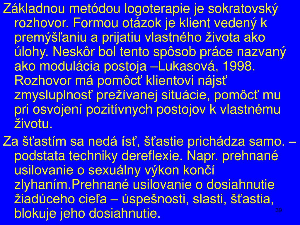 Základnou metódou logoterapie je sokratovský rozhovor. Formou otázok je klient vedený k premýšľaniu a prijatiu vlastného života ako úlohy. Neskôr bol tento spôsob práce nazvaný ako modulácia postoja –Lukasová, 1998. Rozhovor má pomôcť klientovi nájsť zmysluplnosť prežívanej situácie, pomôcť mu pri osvojení pozitívnych postojov k vlastnému životu. Za šťastím sa nedá ísť, šťastie prichádza samo. – podstata techniky dereflexie. Napr. prehnané usilovanie o sexuálny výkon končí zlyhaním.Prehnané usilovanie o dosiahnutie žiadúceho cieľa – úspešnosti, slasti, šťastia, blokuje jeho dosiahnutie.
