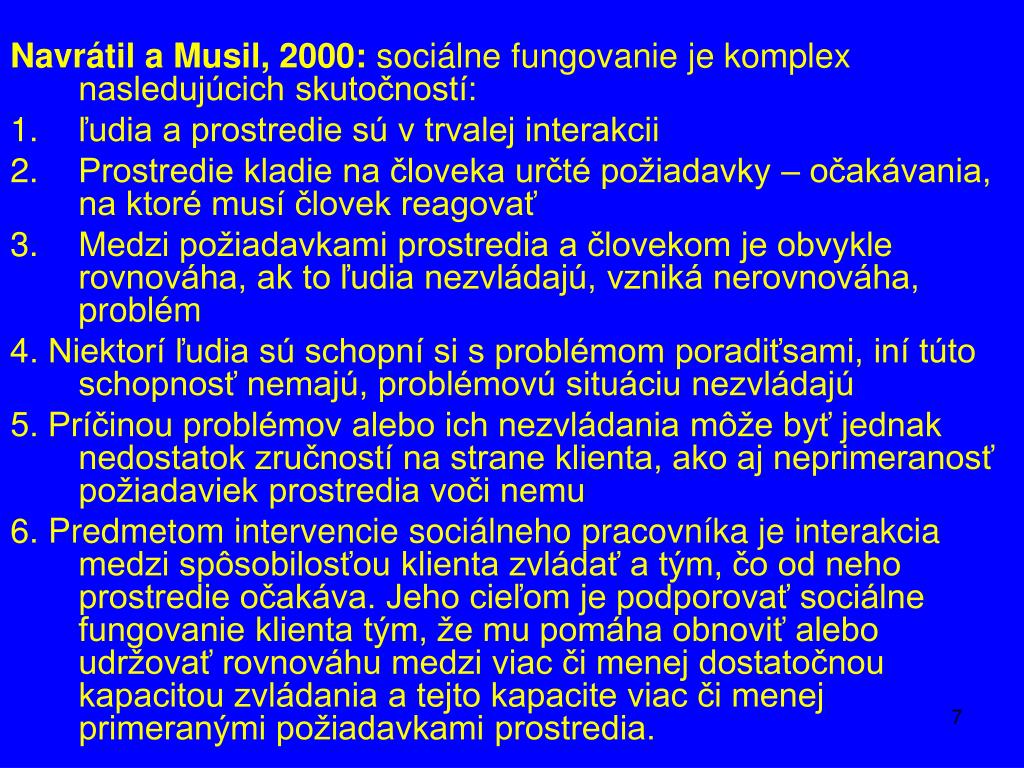 Navrátil a Musil, 2000: sociálne fungovanie je komplex nasledujúcich skutočností: • ľudia a prostredie sú v trvalej interakcii • Prostredie kladie na človeka určté požiadavky – očakávania, na ktoré musí človek reagovať • Medzi požiadavkami prostredia a človekom je obvykle rovnováha, ak to ľudia nezvládajú, vzniká nerovnováha, problém 4. Niektorí ľudia sú schopní si s problémom poradiťsami, iní túto schopnosť nemajú, problémovú situáciu nezvládajú 5. Príčinou problémov alebo ich nezvládania môže byť jednak nedostatok zručností na strane klienta, ako aj neprimeranosť požiadaviek prostredia voči nemu 6. Predmetom intervencie sociálneho pracovníka je interakcia medzi spôsobilosťou klienta zvládať a tým, čo od neho prostredie očakáva. Jeho cieľom je podporovať sociálne fungovanie klienta tým, že mu pomáha obnoviť alebo udržovať rovnováhu medzi viac či menej dostatočnou kapacitou zvládania a tejto kapacite viac či menej primeranými požiadavkami prostredia.