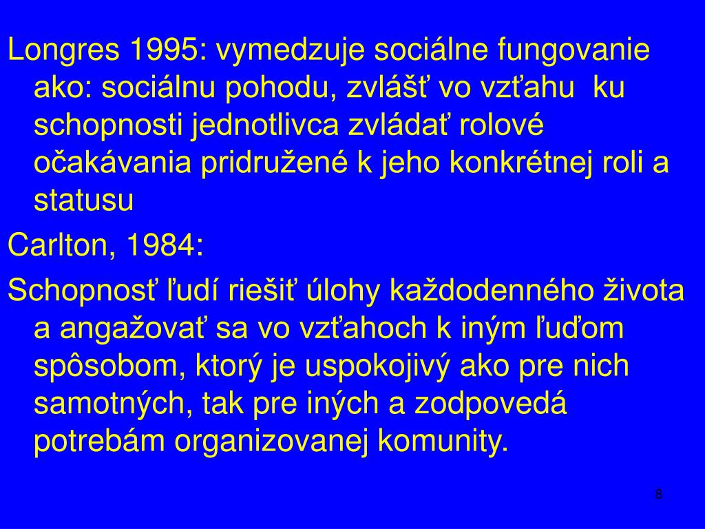 Longres 1995: vymedzuje sociálne fungovanie ako: sociálnu pohodu, zvlášť vo vzťahu ku schopnosti jednotlivca zvládať rolové očakávania pridružené k jeho konkrétnej roli a statusu Carlton, 1984: Schopnosť ľudí riešiť úlohy každodenného života a angažovať sa vo vzťahoch k iným ľuďom spôsobom, ktorý je uspokojivý ako pre nich samotných, tak pre iných a zodpovedá potrebám organizovanej komunity.