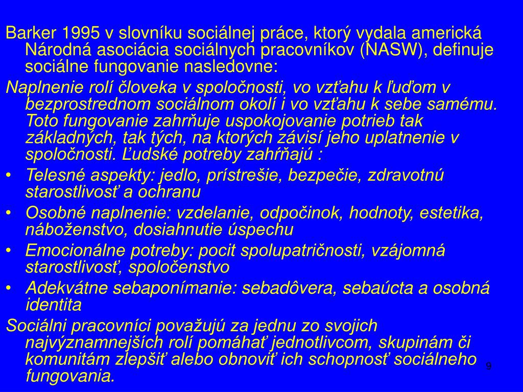 Barker 1995 v slovníku sociálnej práce, ktorý vydala americká Národná asociácia sociálnych pracovníkov (NASW), definuje sociálne fungovanie nasledovne: Naplnenie rolí človeka v spoločnosti, vo vzťahu k ľuďom v bezprostrednom sociálnom okolí i vo vzťahu k sebe samému. Toto fungovanie zahrňuje uspokojovanie potrieb tak základných, tak tých, na ktorých závisí jeho uplatnenie v spoločnosti. Ľudské potreby zahŕňajú : • Telesné aspekty: jedlo, prístrešie, bezpečie, zdravotnú starostlivosť a ochranu • Osobné naplnenie: vzdelanie, odpočinok, hodnoty, estetika, náboženstvo, dosiahnutie úspechu • Emocionálne potreby: pocit spolupatričnosti, vzájomná starostlivosť, spoločenstvo • Adekvátne sebaponímanie: sebadôvera, sebaúcta a osobná identita Sociálni pracovníci považujú za jednu zo svojich najvýznamnejších rolí pomáhať jednotlivcom, skupinám či komunitám zlepšiť alebo obnoviť ich schopnosť sociálneho fungovania.