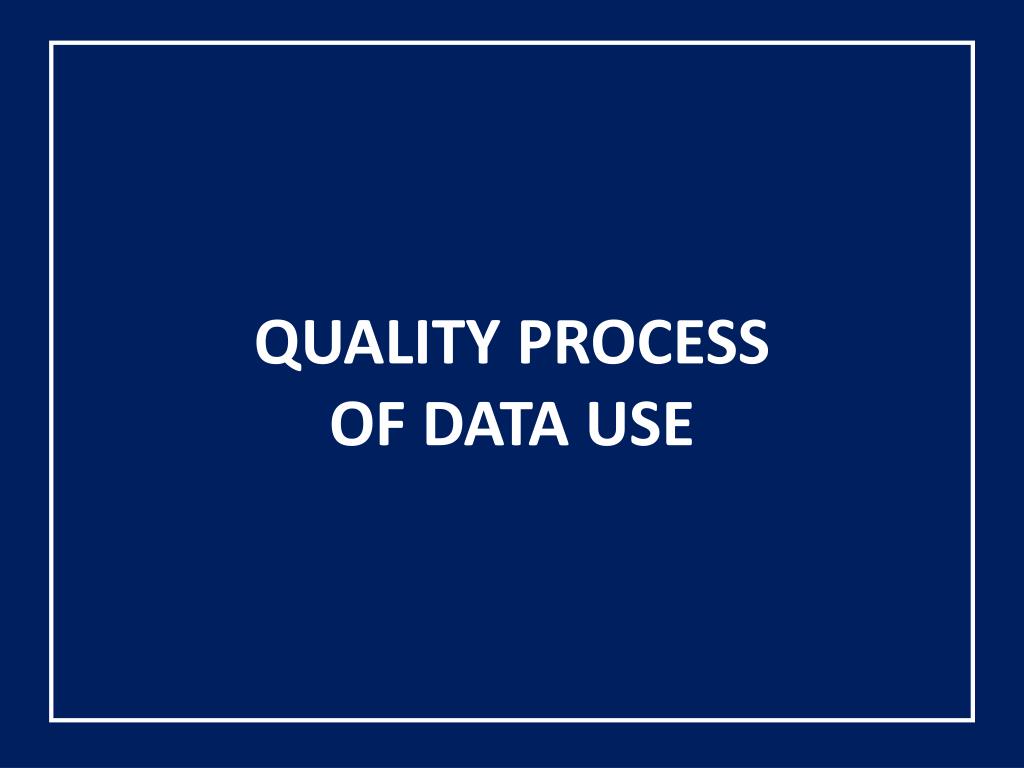 Data Use Process yes Communication Targeted data collection no OK ANALYSIS OF PRESENT STATE Anal Data analysis & interpretation Prioritize needs & options Build consensus & make decisions Identify desired results PRESENT STATE TRANSFORMATION PLANNING Develop targeted plan Identify available data Identify resources Communication Identify evidence-based interventions TRANSITION TO NEW STATE Identify what we want to know Create monitoring & evaluation plan Implement Plans Analyze & rework Collect data for monitoring & evaluation Communication