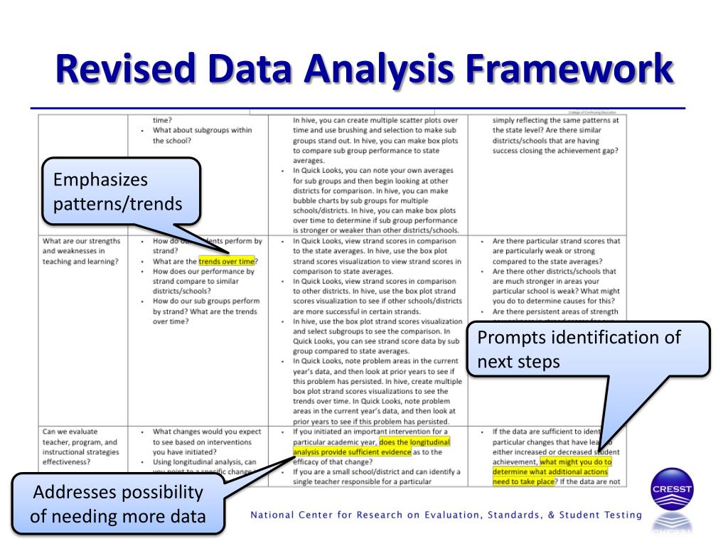 Revised Data Analysis Framework Emphasizes patterns/trends Prompts identification of next steps Addresses possibility of needing more data