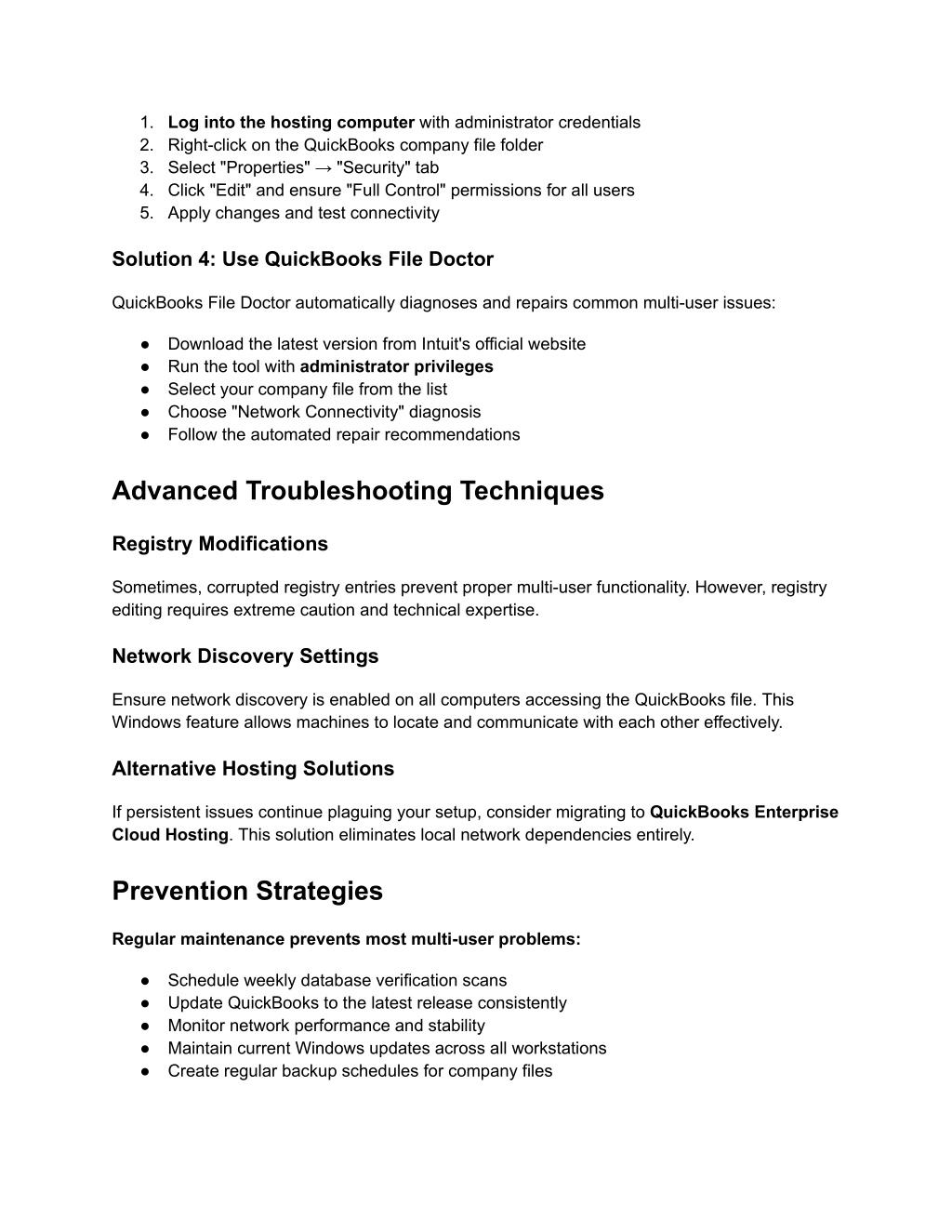 1. Log into the hosting computer with administrator credentials 2. Right-click on the QuickBooks company file folder 3. Select "Properties" → "Security" tab 4. Click "Edit" and ensure "Full Control" permissions for all users 5. Apply changes and test connectivity Solution 4: Use QuickBooks File Doctor QuickBooks File Doctor automatically diagnoses and repairs common multi-user issues: ● Download the latest version from Intuit's official website ● Run the tool with administrator privileges ● Select your company file from the list ● Choose "Network Connectivity" diagnosis ● Follow the automated repair recommendations Advanced Troubleshooting Techniques Registry Modifications Sometimes, corrupted registry entries prevent proper multi-user functionality. However, registry editing requires extreme caution and technical expertise. Network Discovery Settings Ensure network discovery is enabled on all computers accessing the QuickBooks file. This Windows feature allows machines to locate and communicate with each other effectively. Alternative Hosting Solutions If persistent issues continue plaguing your setup, consider migrating to QuickBooks Enterprise Cloud Hosting. This solution eliminates local network dependencies entirely. Prevention Strategies Regular maintenance prevents most multi-user problems: ● Schedule weekly database verification scans ● Update QuickBooks to the latest release consistently ● Monitor network performance and stability ● Maintain current Windows updates across all workstations ● Create regular backup schedules for company files