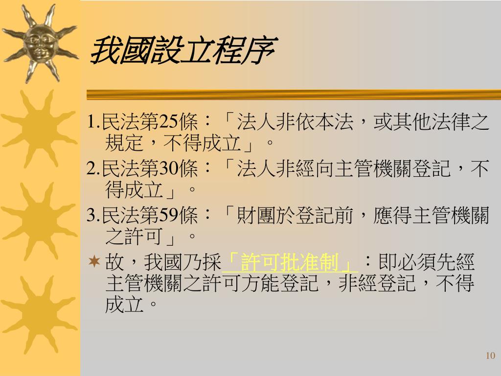 我國設立程序 1.民法第25條:「法人非依本法,或其他法律之規定,不得成立」。 2.民法第30條:「法人非經向主管機關登記,不得成立」。 3.民法第59條:「財團於登記前,應得主管機關之許可」。 • 故,我國乃採「許可批准制」:即必須先經主管機關之許可方能登記,非經登記,不得成立。