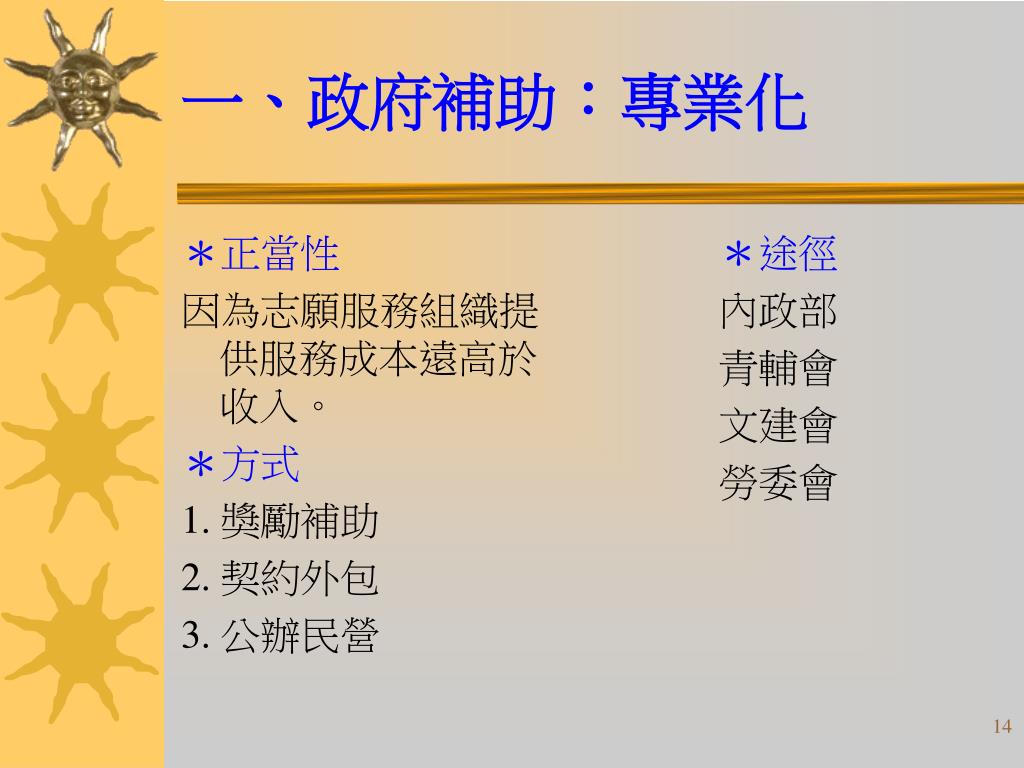 *正當性 因為志願服務組織提供服務成本遠高於收入。 *方式 1. 獎勵補助 2. 契約外包 3. 公辦民營 *途徑 內政部 青輔會 文建會 勞委會 一、政府補助:專業化