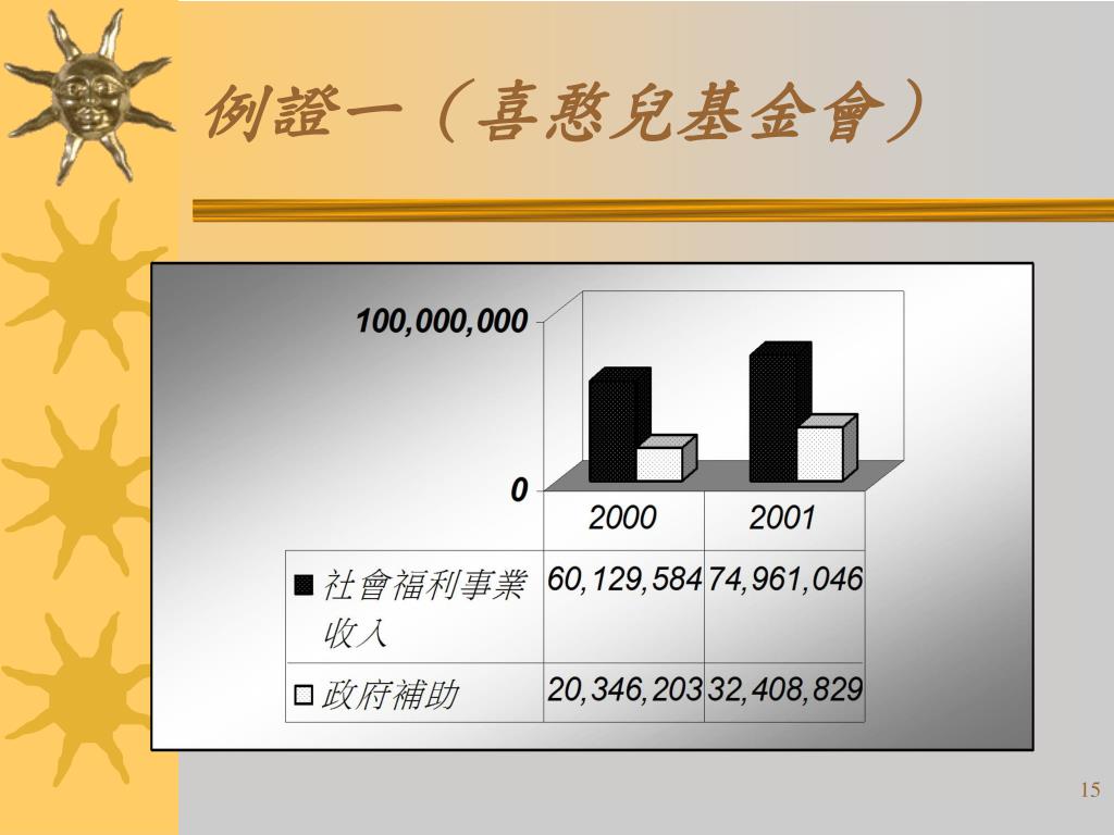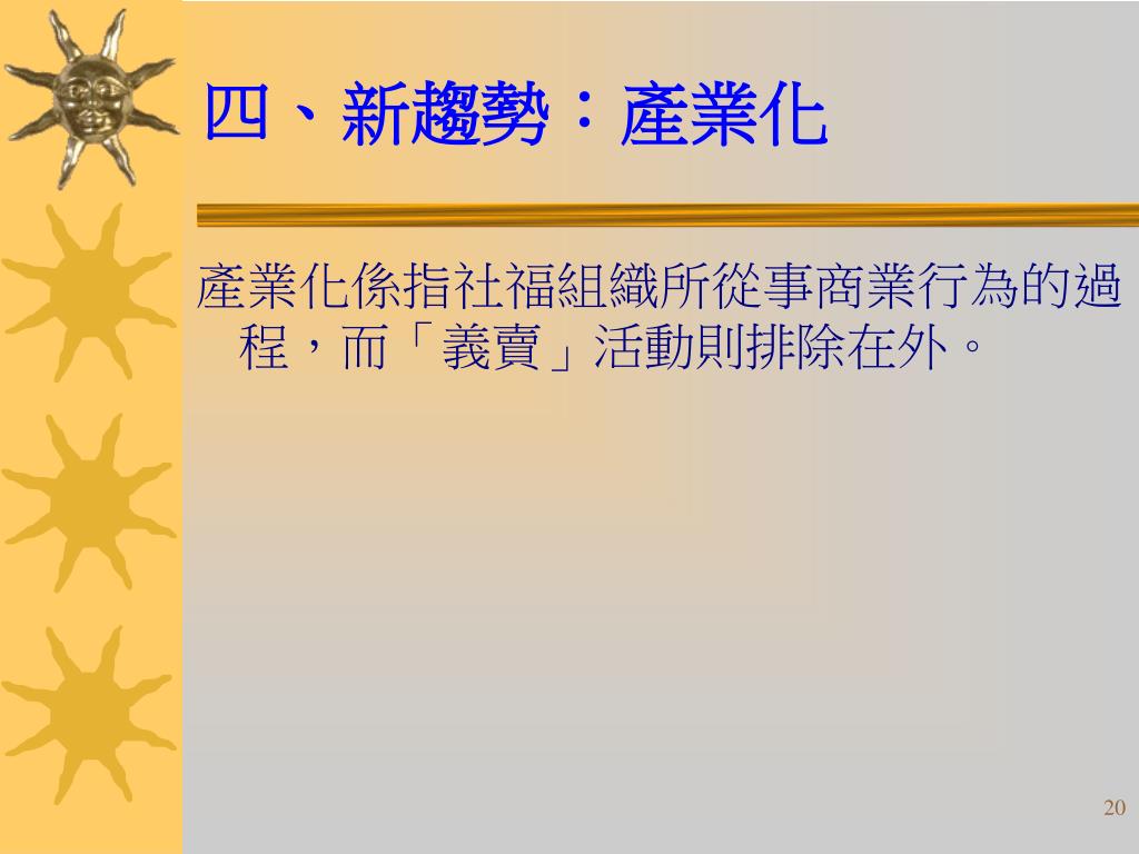 四、新趨勢:產業化 產業化係指社福組織所從事商業行為的過程,而「義賣」活動則排除在外。