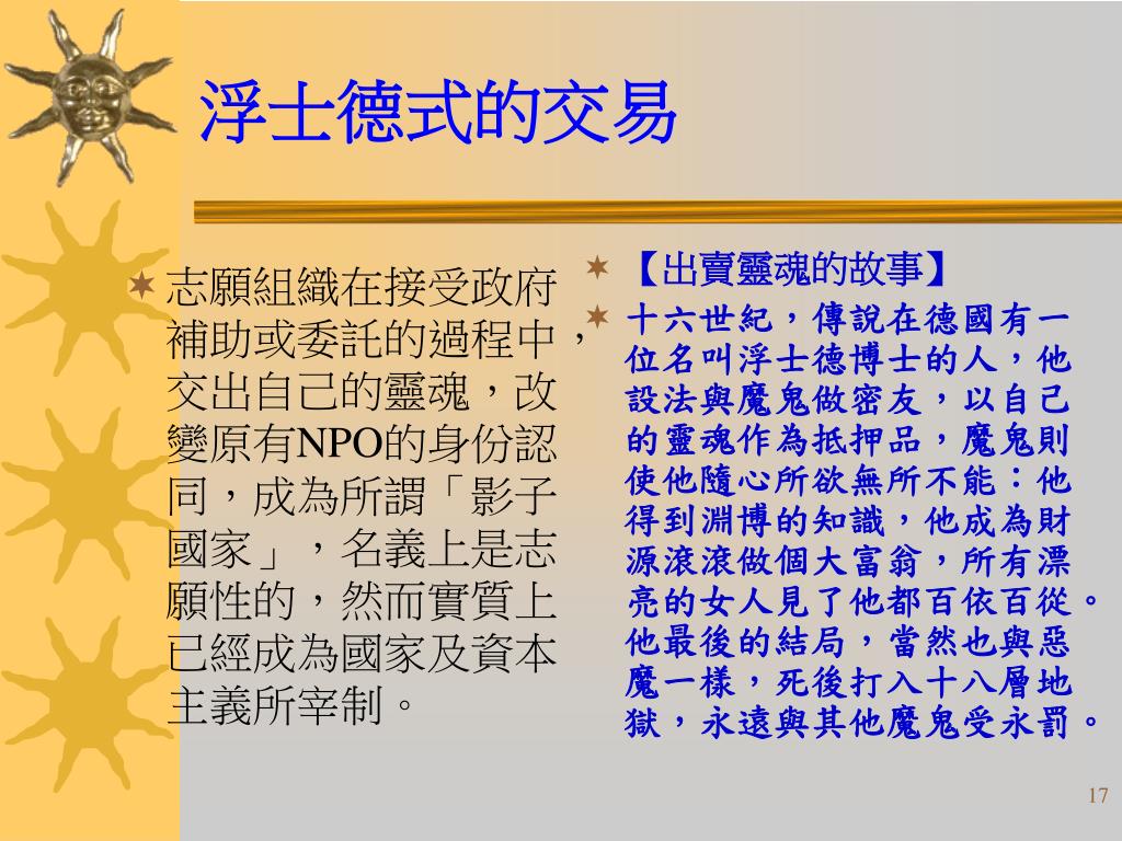 志願組織在接受政府補助或委託的過程中,交出自己的靈魂,改變原有NPO的身份認同,成為所謂「影子國家」,名義上是志願性的,然而實質上已經成為國家及資本主義所宰制。志願組織在接受政府補助或委託的過程中,交出自己的靈魂,改變原有NPO的身份認同,成為所謂「影子國家」,名義上是志願性的,然而實質上已經成為國家及資本主義所宰制。 【出賣靈魂的故事】 十六世紀,傳說在德國有一位名叫浮士德博士的人,他設法與魔鬼做密友,以自己的靈魂作為抵押品,魔鬼則使他隨心所欲無所不能:他得到淵博的知識,他成為財源滾滾做個大富翁,所有漂亮的女人見了他都百依百從。他最後的結局,當然也與惡魔一樣,死後打入十八層地獄,永遠與其他魔鬼受永罰。 浮士德式的交易