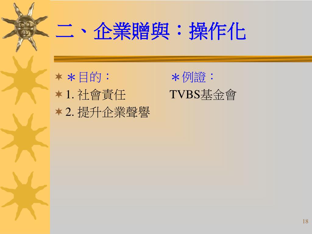*目的: 1. 社會責任 2. 提升企業聲譽 *例證: TVBS基金會 二、企業贈與:操作化