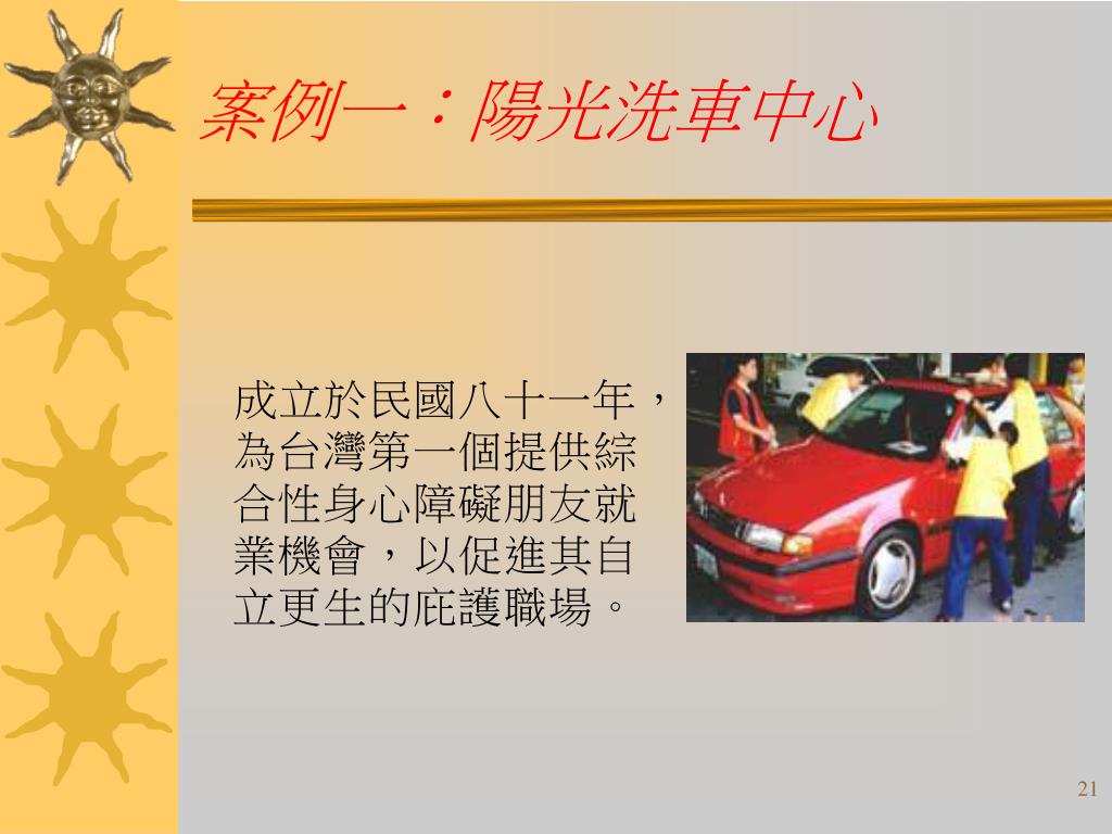 案例一:陽光洗車中心 成立於民國八十一年,為台灣第一個提供綜合性身心障礙朋友就業機會,以促進其自立更生的庇護職場。