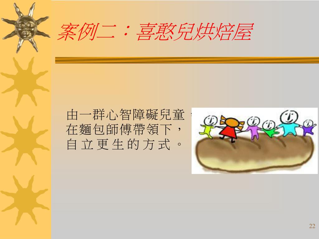 案例二:喜憨兒烘焙屋 由一群心智障礙兒童,在麵包師傅帶領下,自立更生的方式。