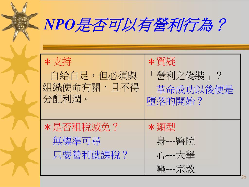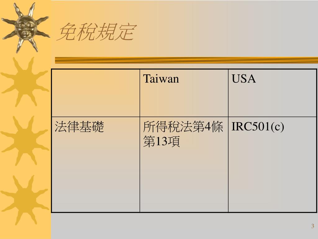 台灣地區 NPO 的現況與發展. 授課老師:鄭勝分. 壹、法規. 免稅規定. 民國 95 年 06 月 14 日修正. 第 4 條左列各種所得,免納所得稅 ︰ 一三 教育、文化、公益、慈善機關或團體,符合行政院規定標準者,其本身之所得及其附屬作業組織之所得。. Taiwan: 所得稅法. USA: 美國國內稅法法則 (Internal Revenue Code). The most common 501(c) organizations include: