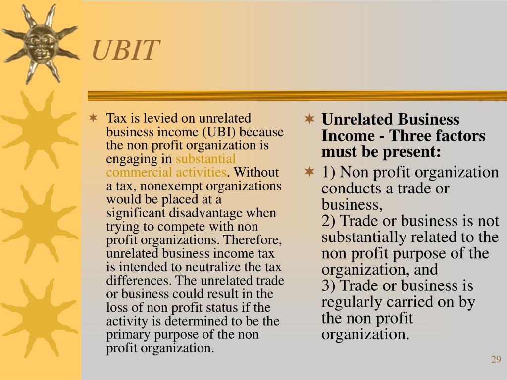 Tax is levied on unrelated business income (UBI) because the non profit organization is engaging in substantial commercial activities. Without a tax, nonexempt organizations would be placed at a significant disadvantage when trying to compete with non profit organizations. Therefore, unrelated business income tax is intended to neutralize the tax differences. The unrelated trade or business could result in the loss of non profit status if the activity is determined to be the primary purpose of the non profit organization. Unrelated Business Income - Three factors must be present: 1) Non profit organization conducts a trade or business,2) Trade or business is not substantially related to the non profit purpose of the organization, and3) Trade or business is regularly carried on by the non profit organization. UBIT
