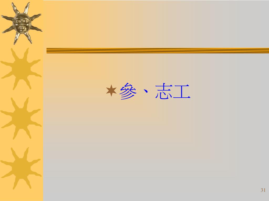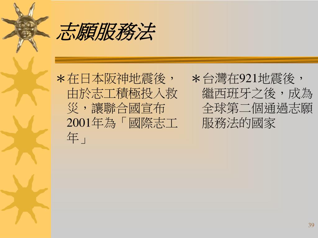 *在日本阪神地震後,由於志工積極投入救災,讓聯合國宣布2001年為「國際志工年」*在日本阪神地震後,由於志工積極投入救災,讓聯合國宣布2001年為「國際志工年」 *台灣在921地震後,繼西班牙之後,成為全球第二個通過志願服務法的國家 志願服務法