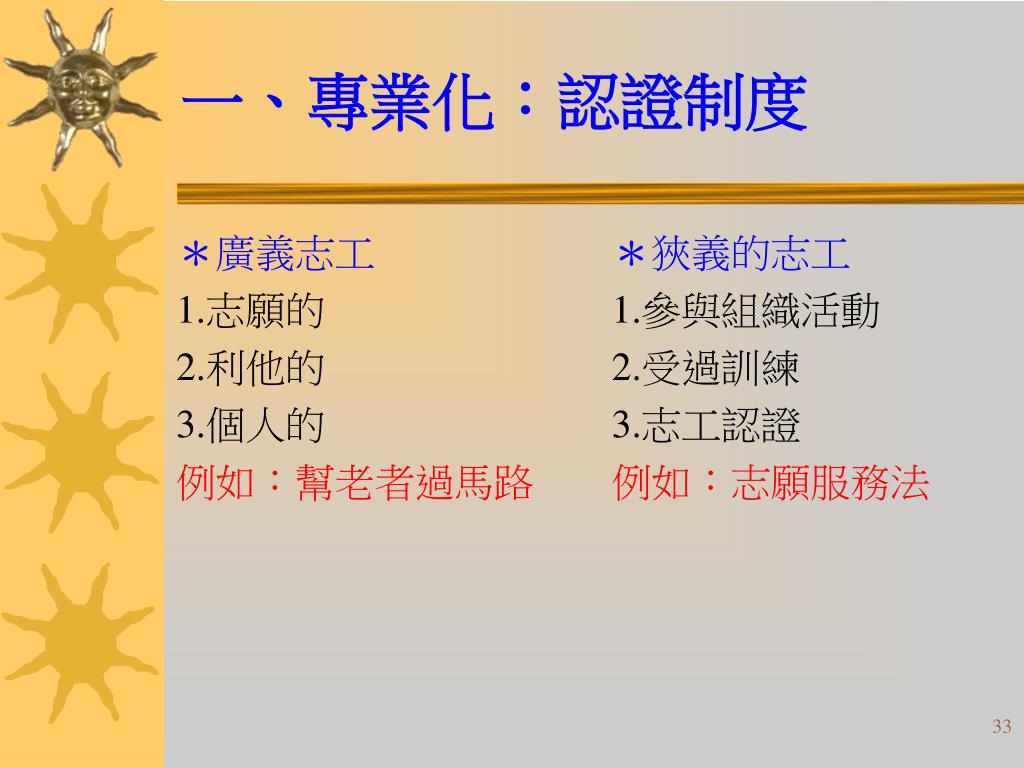 *廣義志工 1.志願的 2.利他的 3.個人的 例如:幫老者過馬路 *狹義的志工 1.參與組織活動 2.受過訓練 3.志工認證 例如:志願服務法 一、專業化:認證制度