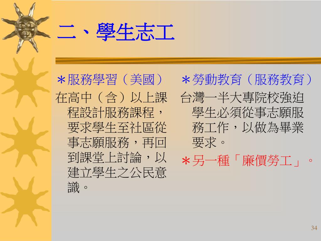 *服務學習(美國) 在高中(含)以上課程設計服務課程,要求學生至社區從事志願服務,再回到課堂上討論,以建立學生之公民意識。 *勞動教育(服務教育) 台灣一半大專院校強迫學生必須從事志願服務工作,以做為畢業要求。 *另一種「廉價勞工」。 二、學生志工