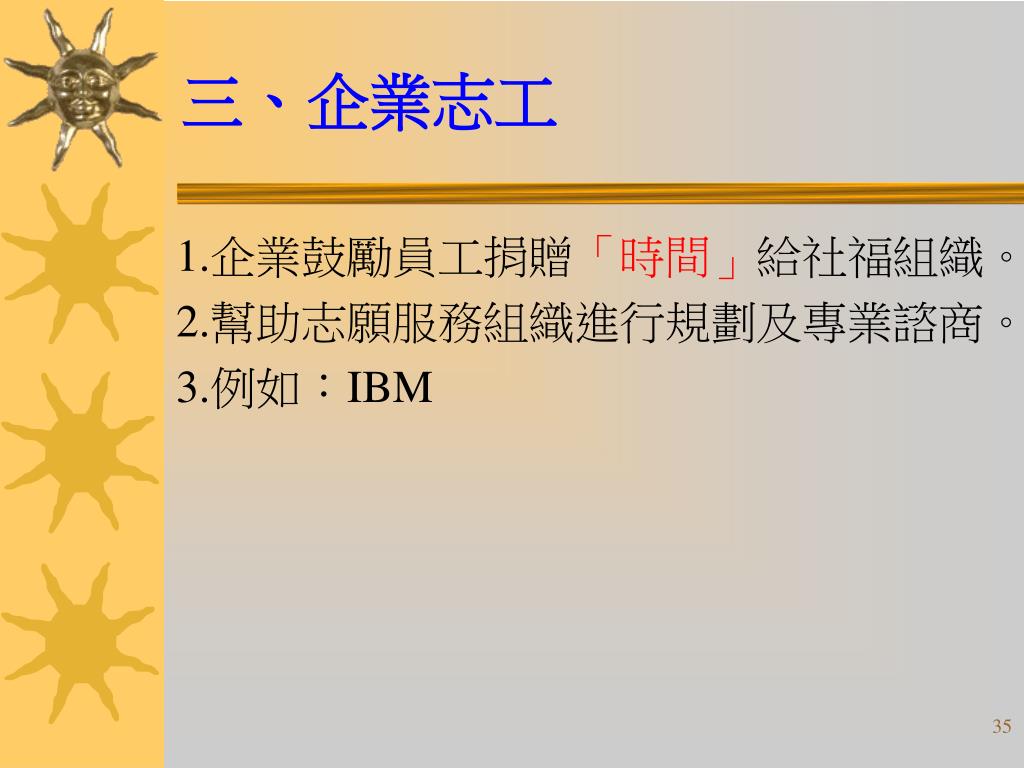 三、企業志工 1.企業鼓勵員工捐贈「時間」給社福組織。 2.幫助志願服務組織進行規劃及專業諮商。 3.例如:IBM