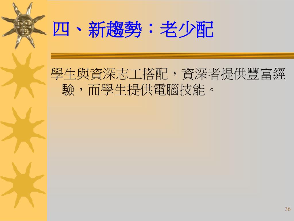 四、新趨勢:老少配 學生與資深志工搭配,資深者提供豐富經驗,而學生提供電腦技能。