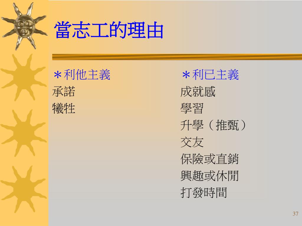 *利他主義 承諾 犧牲 *利已主義 成就感 學習 升學(推甄) 交友 保險或直銷 興趣或休閒 打發時間 當志工的理由