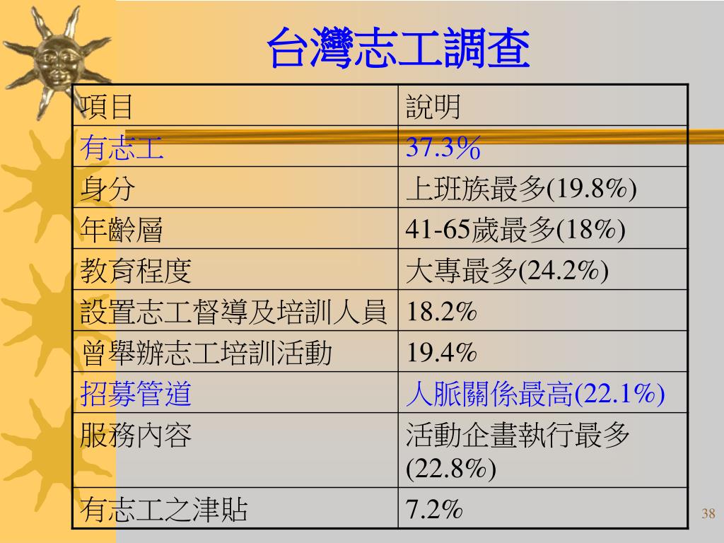 志願服務法評析 • 偏重慈善性及庶務性,不夠多元化 • 募款倫理:政府介入 • 志工管理專業化 • 志工績效評鑑