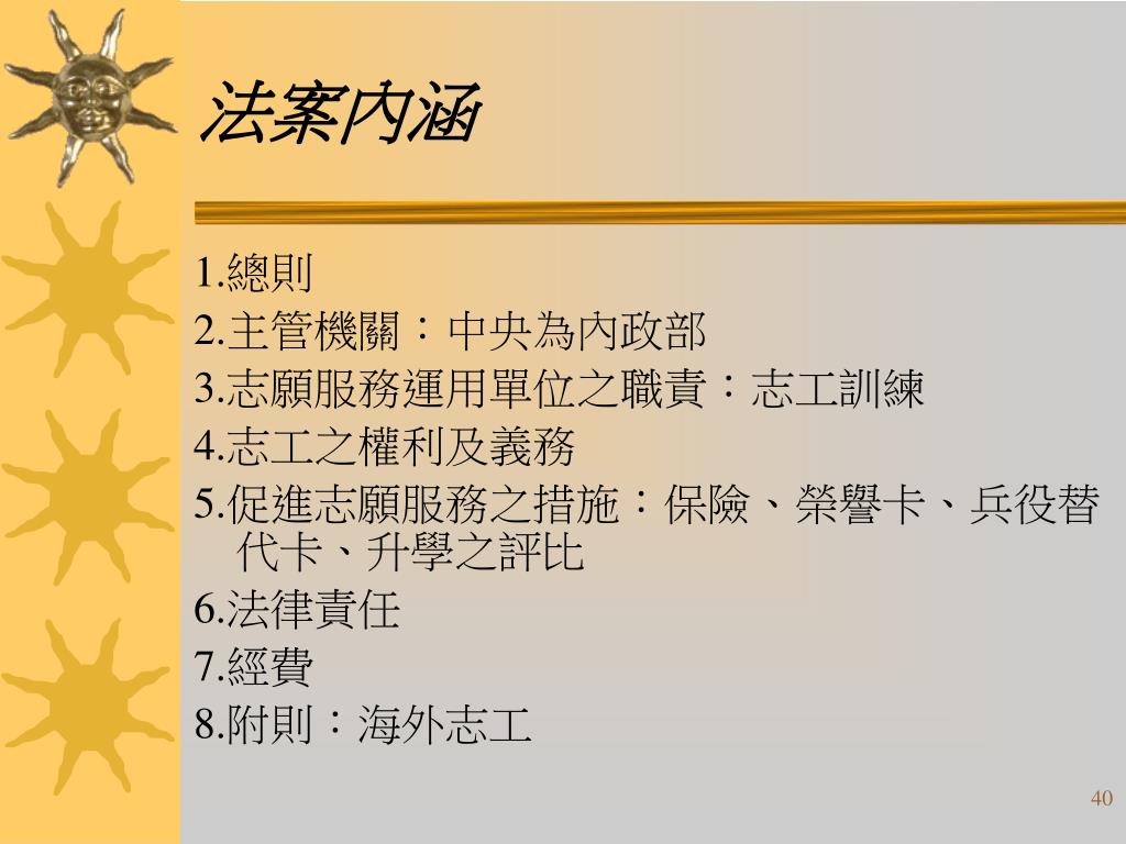 法案內涵 1.總則 2.主管機關:中央為內政部 3.志願服務運用單位之職責:志工訓練 4.志工之權利及義務 5.促進志願服務之措施:保險、榮譽卡、兵役替代卡、升學之評比 6.法律責任 7.經費 8.附則:海外志工