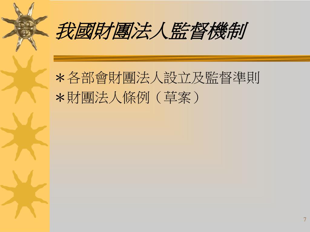 我國財團法人監督機制 *各部會財團法人設立及監督準則 *財團法人條例(草案)