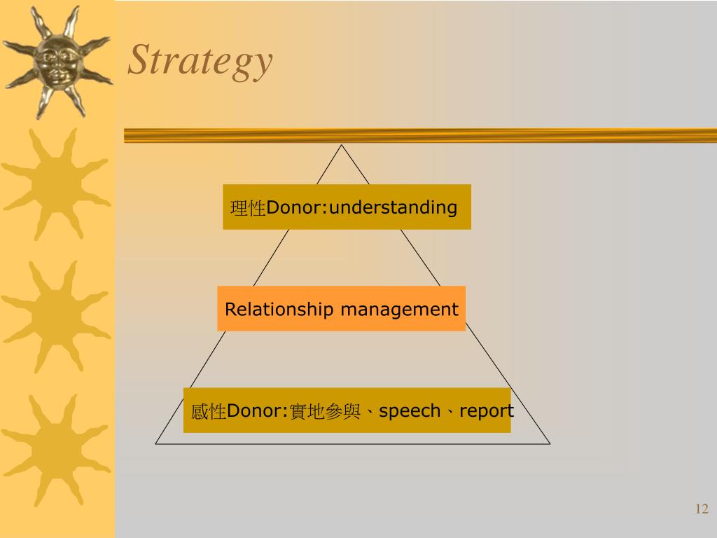 Strategy 理性Donor:understanding Relationship management 感性Donor:實地參與、speech、report